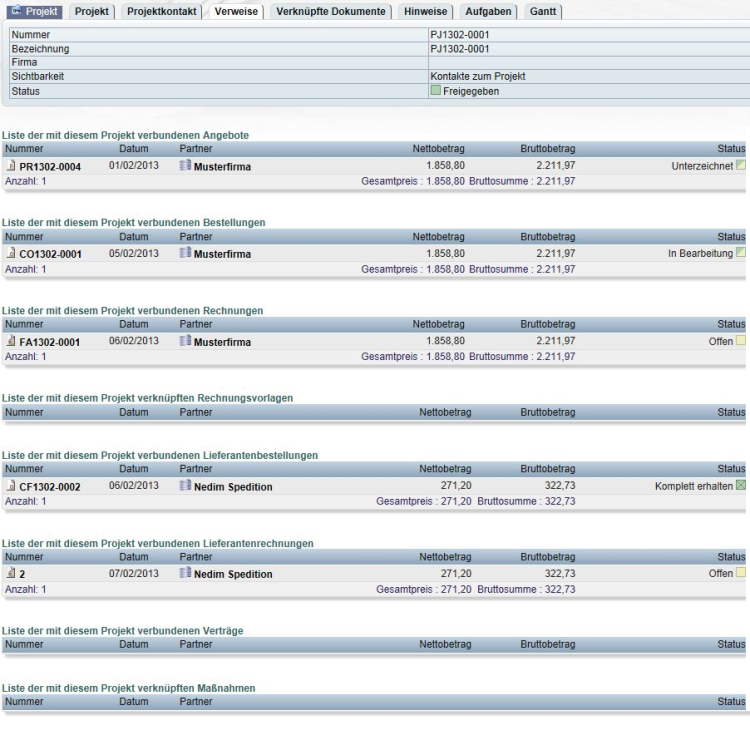 Bei E4K wurden in aller Regel Streckengeschäfte abgebildet. Damit die Zuordnung von einem gesamten Auftrag zuzuordnen und nachzuvollziehen ist, wurde der Funktionsbereich Projekte dafür verwendet. Eine Beispielansicht für das Projekt PJ1302-0001 und dessen zugehörigen Verweise können der nachfolgenden Abbildung entnommen werden.