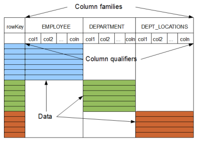 Tabellen im klassischen Sinne gibt es nicht. Spalten, die als zusammenhängend betrachtet und auf die auch gemeinsam zugegriffen werden sollen, lassen sich als Sammlung zu Spaltenfamilien aggregieren und stellen so etwas Ähnliches wie die Tabellen im relationalen System dar.