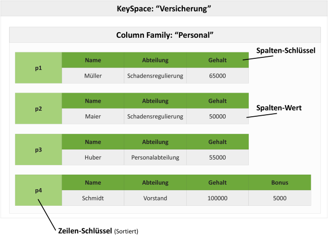 Eine Spaltenfamilie „Personal“ könnte im konkreten Beispiel in Cassandra etwa so umgesetzt werden (ohne Beachtung der Zeitstempel):
