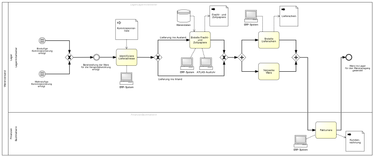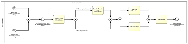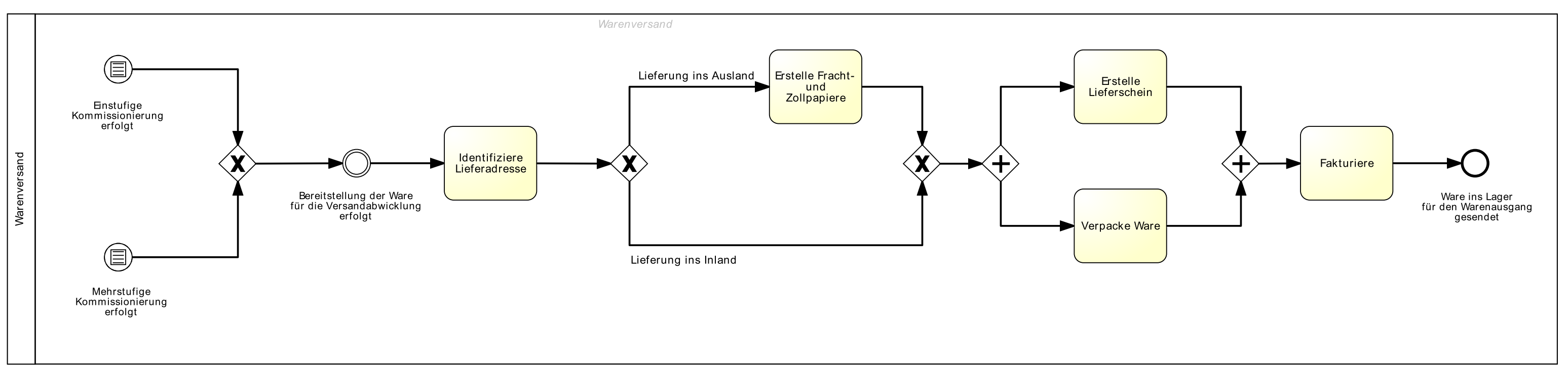 Das in diesem Abschnitt gezeigte BPMN-Diagramm ist eine Abbildung des EPK-Diagramms, das sich auf der ARIS-Ebenenmodell-Seite befindet. Es wurde nach den Konvertierungsregeln erstellt, die für die Überführung von EPK-Modellen in BPMN-Modelle konzipiert wurden. Die Funktionen und Konnektoren aus dem EPK-Modell sind eins zu eins übernommen und finden sich als Blankoaufgaben und Gateways in dem BPMN-Diagramm wieder. Die Abbildung von Ereignissen bedarf einer differenzierten Behandlung. Es wurden zunächsts die Prozessschnittstellen als Start- und Endereignisse mit den Bezeichnungen übernommen. Da es sich um betriebswirtschaftliche Bedingungen für den Start des Prozesses handelt, sind sie entsprechend typisiert gezeichnet worden. Da die Prozessschnittstelle am Ende des Prozesses lediglich den Übergang zum nächsten Prozess darstellt, wurde es als Blankoendereignis abgebildet. Die Ereignisse primitiver Natur, die lediglich den Abschluss einer Funktion auszeichnen, wurden ausgelassen. Lediglich ein Ereignis, das für den betriebswirtschaftlichen Zustand und Ablauf des Prozesses eine Bedeutung hat, ist als ein Prozessmeilenstein in Form eines auslösenden Blankozwischenereignisses modelliert worden. Die Ereignisse, die in dem EPK-Modell die Bedingungen für die Fallunterscheidung bzw. Ablaufverzweigung formulieren, wurden nicht übernommen. Stattdessen sind die Bedingungen an die aus dem XOR-Gateway auslaufenden Kanten angefügt worden.