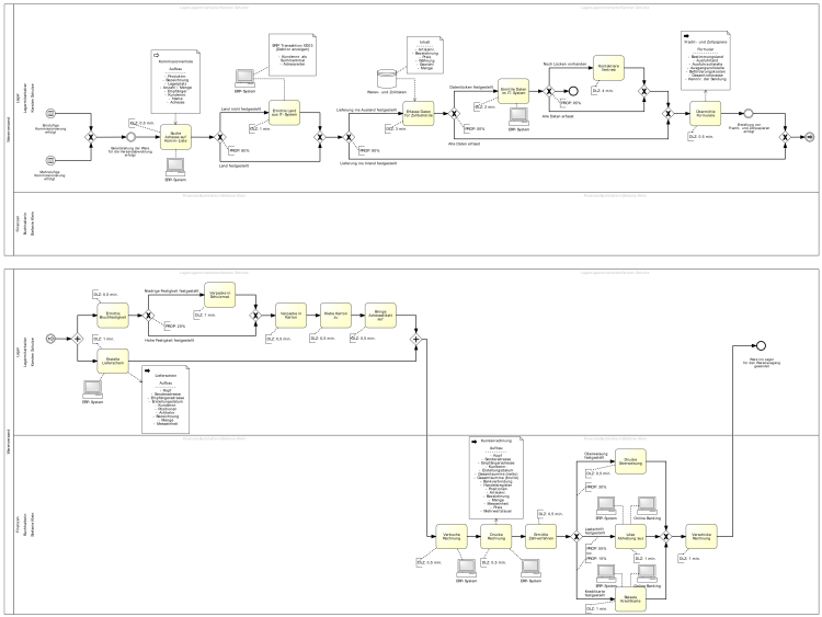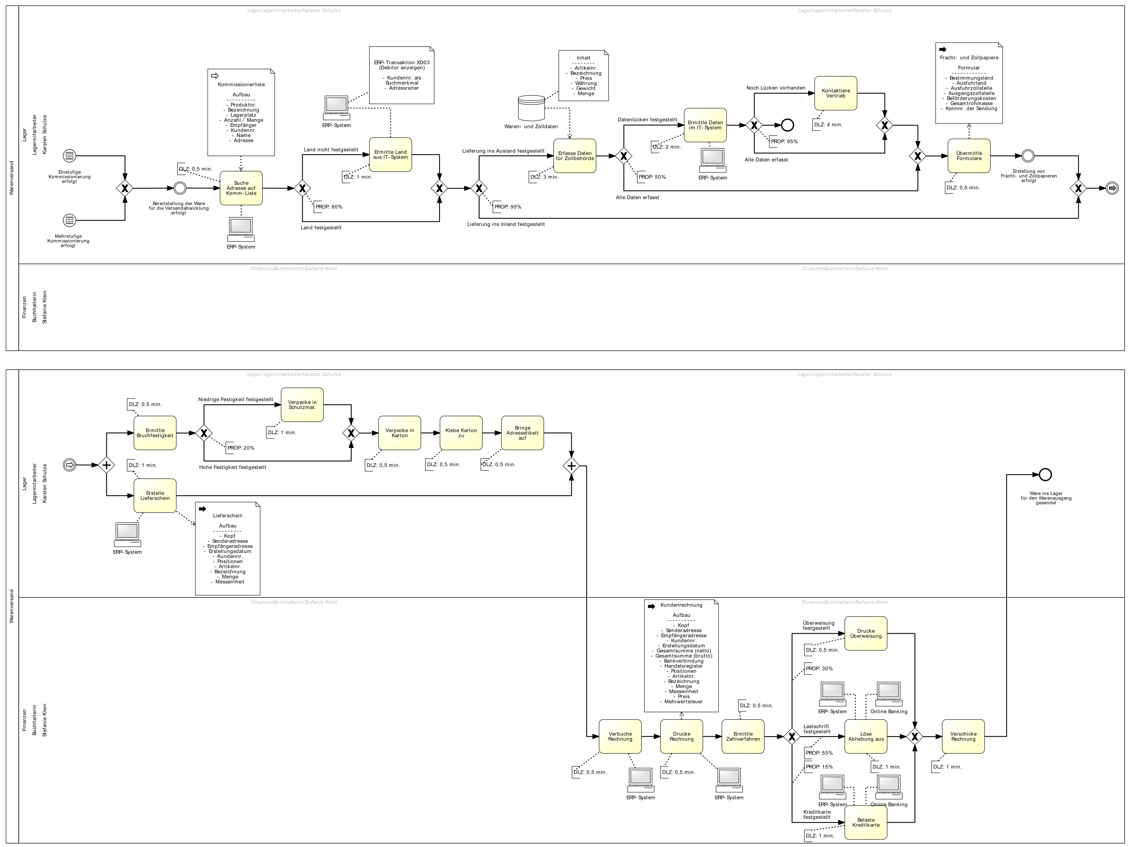Auf der Ebene 4 wird das Geschäftsprozessmodell um einige weitere Elemente ergänzt. Den Funktionen in dem EPK-Diagramm werden Organisationseinheiten, IT-Systeme und Datenobjekte zugeordnet. Die an den Aufgaben beteiligte Stellen und Einheiten geben die Rollen im BPMN-Modell in Form von Swimlanes wieder. Die Abbildung von IT-Systemen, Datenspeichern und sonstiger Datenobjekte wie z.B. Dokumente erfolgt durch das Vorhandensein von entsprechenden Pendants in beiden Notationen sehr einfach. Ob ein Datenobjekt für die Bearbeitung der Aufgabe hinzugefügt oder in der Aufgabe erzeugt wird, kann durch gerichtete Datenflusspfeile bzw. Input-, Outputpfeile gekennzeichnet werden.