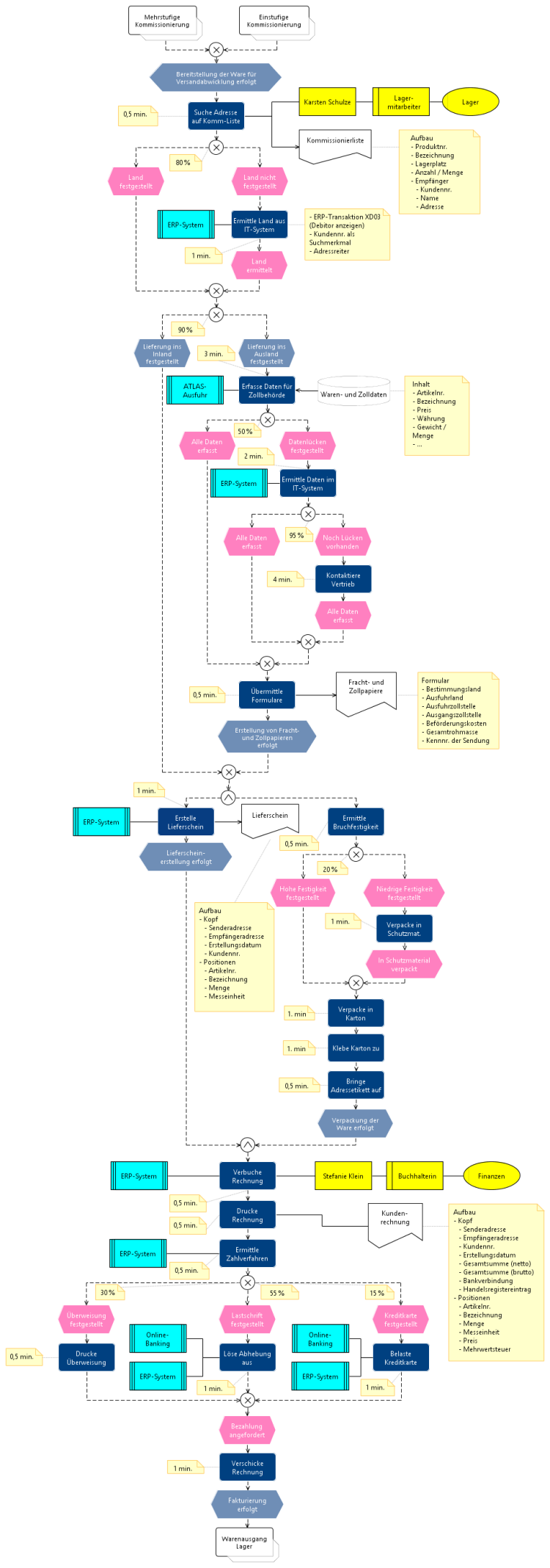 Diese Ebene unterscheidet sich von den anderen EPK-Ebenen durch ihre höhere Detaillierung. Die Tätigkeiten werden in die kleinstmöglichsten Arbeitsschritte unterteilt, die eine Person ausführen kann. Ebenfalls ist auch die konkrete für eine Tätigkeit verantwortliche Person mit seinem Namen anzugeben. Ferner muss nicht nur angegeben werden, woher die für die Bearbeitung nötigen Informationen kommen, sondern auch die ihr zugrundeliegenden Daten möglichst vollständig und sturkturiert beschrieben werden. Für die Ermittlung der Durchlaufzeiten sind die Tätigkeiten nach dem Zeitaufwand zu bewerten und Verlaufpfade mit Wahrscheinlichkeitsangaben zu kennzeichnen. Die letzten beiden Eigenschaften können auch auf Ebene 4 eingesetzt werden. Es folgt das Modell des Versandabwicklungsprozesses auf der höchsten Detaillierungsebene als Beispiel