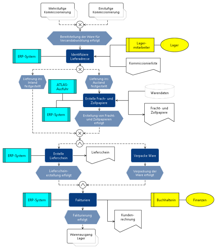 Eine EPK beschreibt wie ein Geschäftsprozess abläuft. Auf der 3. Modellierungsebene zeigt eine Abfolge von Ereignissen und Tätigkeiten den Verlauf des Prozesses. Um eine Tätigkeit von einem Prozess abzugrenzen müssen Fragen zur Granularität einzelner Funktionen/Tätigkeiten beantwortet werden. Die Tätigkeiten sollten so definiert werden, dass deren Ergebnisse betriebswirtschaftlich relevante Ereignisse darstellen. Anders ausgedrückt: die Funktion muss ein Ergebnis liefern, das problemlos als eine Aufforderung für den Beginn der nächsten Tätigkeit verstanden wird und als Input für sie genutzt werden kann. Eine Funkton sollte in der aller Regel von einem max. zwei Verantwortlichen ausgeführt werden können. Ebenfalls muss sie als ein einzelner Schritt abgenzbar sein und ist in den meisten Fällen von kurzer Dauer. Der Verlauf des Versandabwicklungsprozesses in Form einer EPK kann als ein Beispiel diese Überlegungen betrachtet werden.