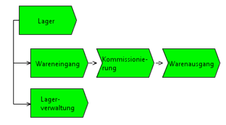 Die Wertschöpfungskette beschreibt welche Geschäftsprozesse ein Unternehmen durchführt. Ferner können die Prozesse abhängig von der Reihenfolge, in der sie ausgeführt werden, zueinander in Beziehung gebracht werden. Ebenso ist eine hierarchische Beziehung modellierbar. Diese Ebene sollte nur Vorgänge enthalten, die aus der Perspektive des ganzen Unternehmens bzw. seiner Geschäftsbereiche von hoher Bedeutung sind und als Geschäftsprozesse definiert und abgegrenzt werden können. Sie gibt somit einen groben Überblick über die wichtigsten und größten in sich aus betriebswirtschaftlicher Sicht abgeschlossen Abläufe. Als Beispiel seien die Prozesse aufgeführt, die den Lagerbereich abbilden. Im Lager finden Abläufe zur Warenverwaltung sowie zur Warenbewegung statt. Die Warenbewegung besteht aus nacheinander abfolgenden Prozessen Wareneingang, Kommissionierung und Warenausgang.
