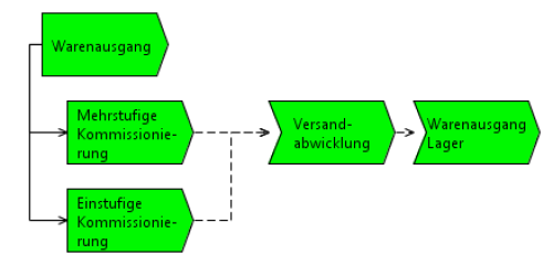 Die Prozesse aus der obersten Ebene sollten in kleinere Geschäftsprozesse unterteilt werden. Auf diese Weise wird gewährleistet, dass eine feinere Steuerung und Überwachung des Betriebsgeschehens möglich ist. Auf der anderen Seite stellt sich die Frage nach der Abrenzung zwischen (Teil)Prozessen und Funktionen / Tätigkeiten, aus denen sie bestehen. Oder anders ausgedrückt - wann ist ein Vorgang kein Prozess mehr, sondern eine einfache Tätigkeit? Ein Geschäftsprozess muss eine noch erfass- bzw. beobachtbare Auswirkung auf das Betriebsgeschehen haben. Die Auswirkung wird anhand von Zielen definiert, die mit Hilfe von Kennzahlen zu überwachen sind. Eine einfache Tätigkeit hingegen hat eine so geringe Auswirkung, dass die Erfassung als Prozess und dessen Unterteilung in weitere Schritte nicht mehr sinnvoll ist. Das Beispiel für die 2. Ebene zeigt die Aufteilung des Warenausgangsprozesses in weitere Teilprozesse.